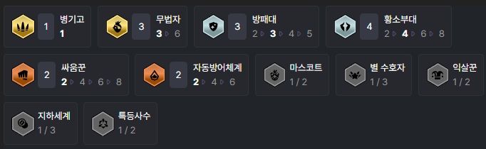 덱을 완성시키면 병기고(1), 무법자(3), 방패대(3), 황소부대(4), 싸움꾼(2), 자동방어체계(2) 특성을 챙길 수 있습니다.