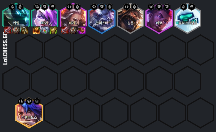 무법자 카밀 리롤덱은 기본적으로 블리츠크랭크, 탈론, 바이, 카밀, 알리스타, 비에고, 에코, 아펠리오스로 이루어져 있습니다.