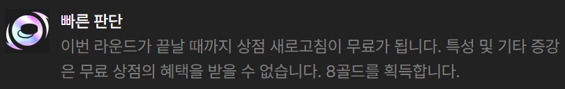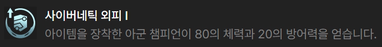 그 외의 증강체로는 방패대, 자동방어체계 관련 증강체나 상점 관련 증강체가 어울리며, 전투 관련 증강체로는 경량급, 초월이 어울립니다. 그 외에도 사이버네틱 통신, 외피, 재생의 바람, 사냥의 전율, 천상의 축복같은 증강체도 무난합니다.