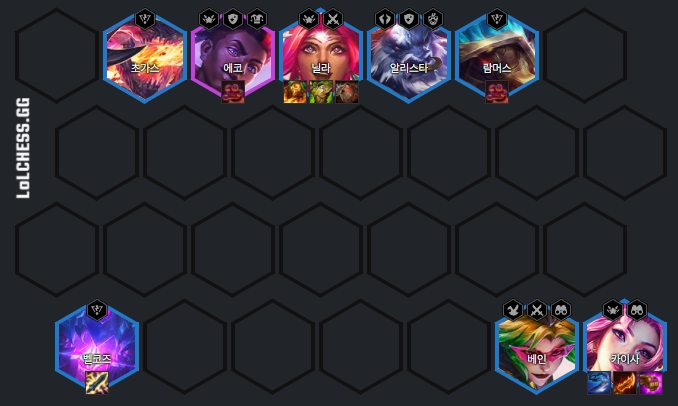 기본적으로 닐라, 람머스, 베인, 벨코즈, 알리스타, 초가스, 카이사, 에코로 이루어져 있습니다. 5코스트 챔피언이 포함되지 않기 때문에 덱을 완성시키기가 쉬운 편입니다.