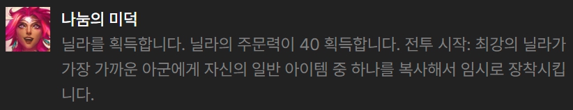 카이사에게 구인수의 격노검, 보석 건틀릿, 거인 학살자를 주는 것을 최우선으로 하며, 방어형 아이템의 경우 닐라에게 몰아주고, 벨코즈나 베인에게 스태틱 하나 정도를 주면 괜찮습니다. 이후에는 유연하게 아이템을 주면 됩니다.