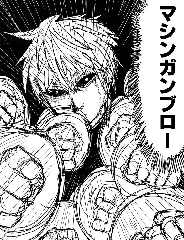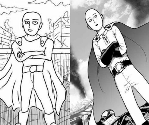 보는 사람도 같은 작품인가 의심할 정도인데요, 같은 작품 맞고, 왼쪽이 원작 오른쪽이 리메이크 버전입니다. 애니메이션 원펀맨은 바로 이 리메이크 버전을 애니메이션화 한 것이죠. 낙서 같이 보이는 것을 엄청난 작화로 표현한 것을 확인할 수 있습니다.