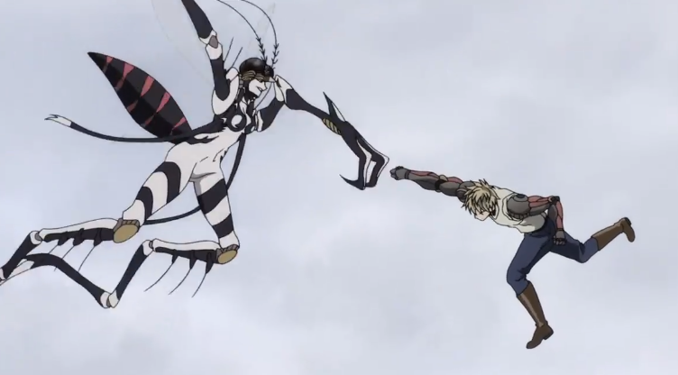 마지막까지 보면 알 수 있겠지만 중간까지는 그냥 제노스(사이보그 인간)가 주인공처럼 보입니다. 싸우다가 제노스가 모기 괴인에게 패배하고 자폭을 하려는 순간 사이타마가 모기 괴인을 단 한방으로 잡고 "모기, 짜증나"라는 대사를 날리죠. 뭐 만화나 애니메이션으로 본 사람들은 알겠지만 이 사건때문에 제노스는 사이타마에게 찾아가 제자로 받아달라 합니다.