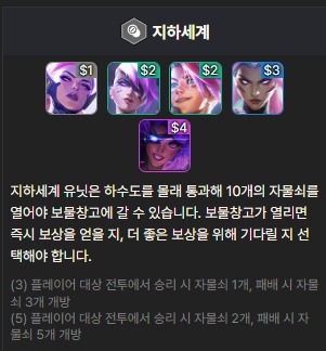 지하세계 특성은 지하세계(3)일 때 플레이어 대상 전투에서 승리 시 자물쇠 1개, 패배 시 자물쇠 3개가 개방됩니다. 또한 지하세계(5)일 때에는 플레이어 대상 전투에서 승리 시 자물쇠 2개, 패배 시 자물쇠 5개가 개방됩니다. 이 자물쇠는 10개가 개방될 때 마다 보상이 제시되는데, 즉시 보상을 받을 수도 있지만, 받지 않고 미룰 수도 있습니다. 그리고 보상을 미루면 미룰수록 더 좋은 보상을 얻을 수 있죠. 지하세계 특성에 해당되는 유닛은 케일, 바이, 이즈리얼, 소나, 사미라 이렇게 다섯입니다.