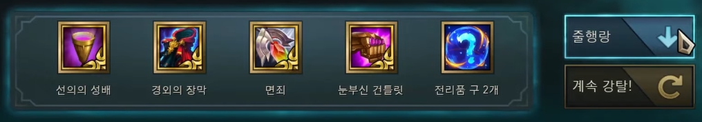 | 10% | 완성 아이템 2개, 전략가의 왕관, 찬란한 아이템, 전략가의 왕관, 완성 아이템 2개 |