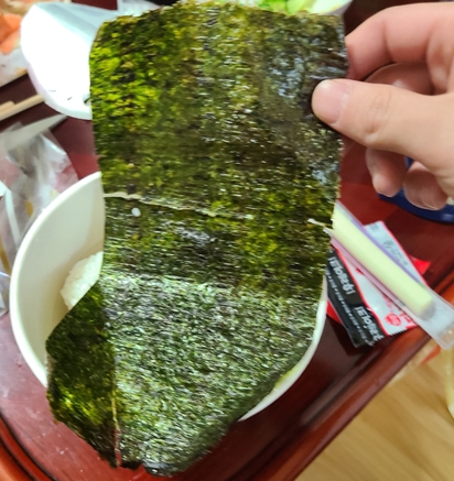 이후 참치마요 삼각김밥에서 김을 빼고 넣습니다. 참치마요네즈 삼각김밥에서 뺀 김은 가위로 잘게 잘라주거나 혹은 손으로 찢어서 넣어줍니다.