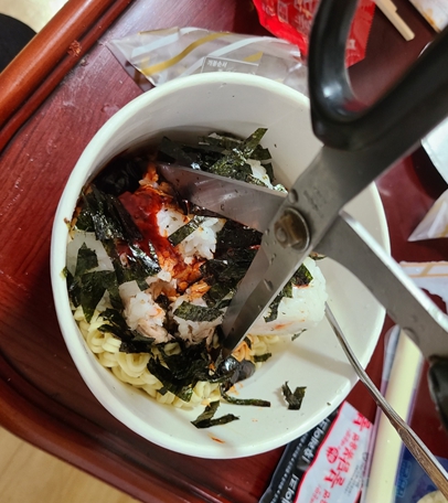 가위로 면과 함께 난도질을 해주며 잘 섞어줍니다. 면이 길면 숟가락으로 퍼먹을 때 면이 계속 올라와 한 입에 먹기 불편합니다.
