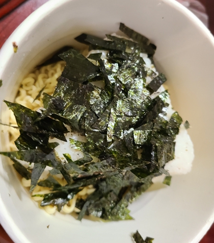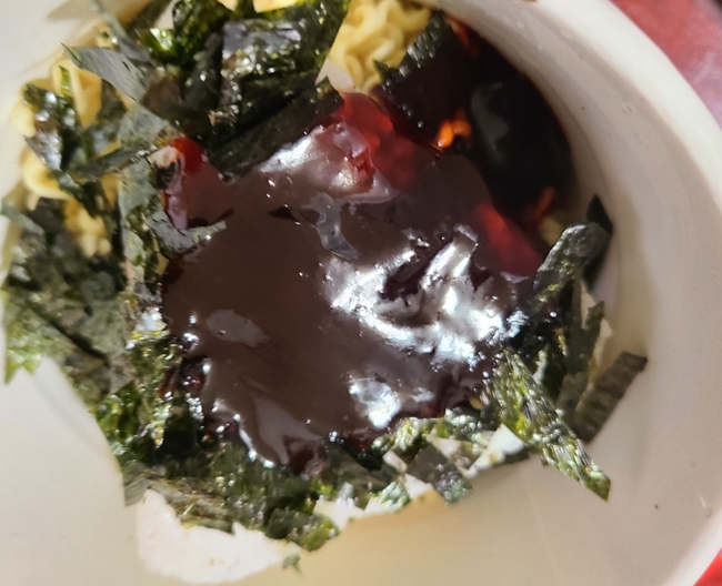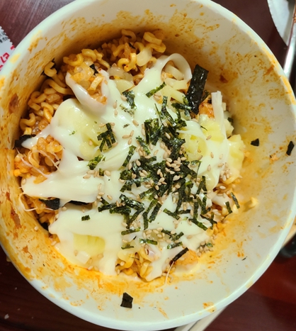 마지막으로 불닭볶음면 컵라면에 동봉되어 있던 김가루와 깨가 들어있는 건더기스프를 넣어주고 다시 한 번 비벼주면 완성입니다.