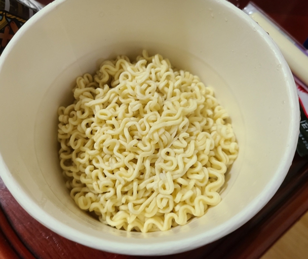 먼저 불닭볶음면 컵라면 면에 뜨거운 물을 부어 면을 다 익혀줍니다. 그리고 물을 버려주는데, 바닥에서 0.5mm정도 남아있을정도로(?) 소량의 물을 남기면 비벼줄 때 더 잘 비벼집니다.