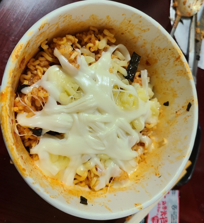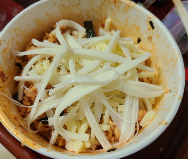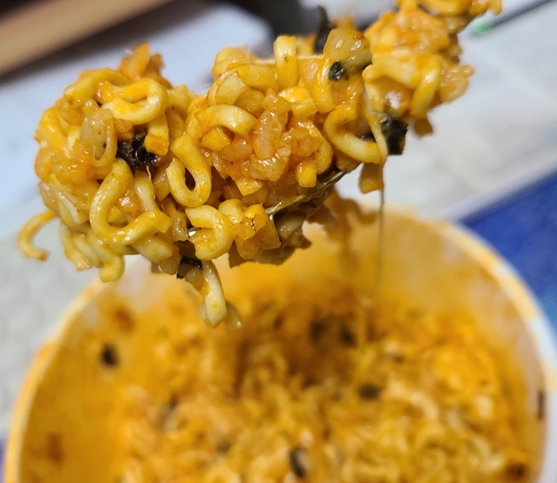그냥 불닭볶음면은 매운맛이 너무 강했다면, 이건 참치마요 및 치즈가 매운 맛을 어느 정도 잡아주기 때문에 비교적 매운 맛이 덜하다고 할 수 있습니다. 또한 치즈가 쫙쫙 늘어나는 것을 볼 수 있어서 시각적으로도 좋으며, 맛도 상당히 맛있었습니다. 아쉬운 점은 참치의 양이 상당히 부족하다고 느껴졌다는 점이네요. 또 시간이 지나면 치즈가 당연히 굳어버립니다.