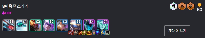 이번 시간에 알아볼 롤토체스 시즌8 덱은 바로 8싸움꾼 소라카덱입니다. 8싸움꾼 소라카덱은 싸움꾼 특성으로 인한 높은 추가 체력으로 안정적인 전투를 운영하기에 좋습니다. 그렇다면 과연 8싸움꾼 소라카덱은 어떤 챔피언들로 구성되어 있고, 어떤 특성들을 챙기는지, 증강체는 무엇이 좋은지, 아이템은 무엇을 누구에게 주는지, 그리고 기본적인 운영법까지 한번 알아보도록 하겠습니다.