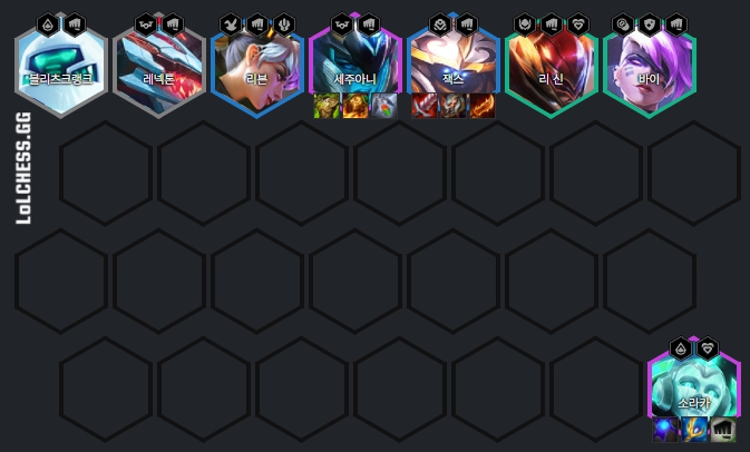 레넥톤, 블리츠크랭크, 리신, 바이, 리븐, 잭스, 세주아니, 소라카 이렇게 8명으로 구성되어 있으며, 소라카를 제외한 모든 기물이 기본적으로 싸움꾼 기물입니다.