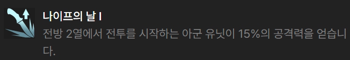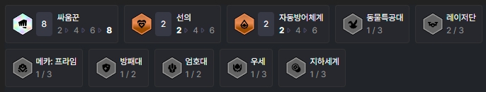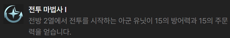 그 외에는 싸움꾼(8)을 완성시키기 위한 싸움꾼 특성 증강, 고대의 기록 보관소가 1순위이며, 그 외는 대부분 기물을 앞에 배치하는 특성상 전방 2열 관련 증강체가 좋습니다. 또한 사냥의 전율, 재생의 바람, 천상의 축복같은 전투 관련 증강체들은 무난한 편입니다.