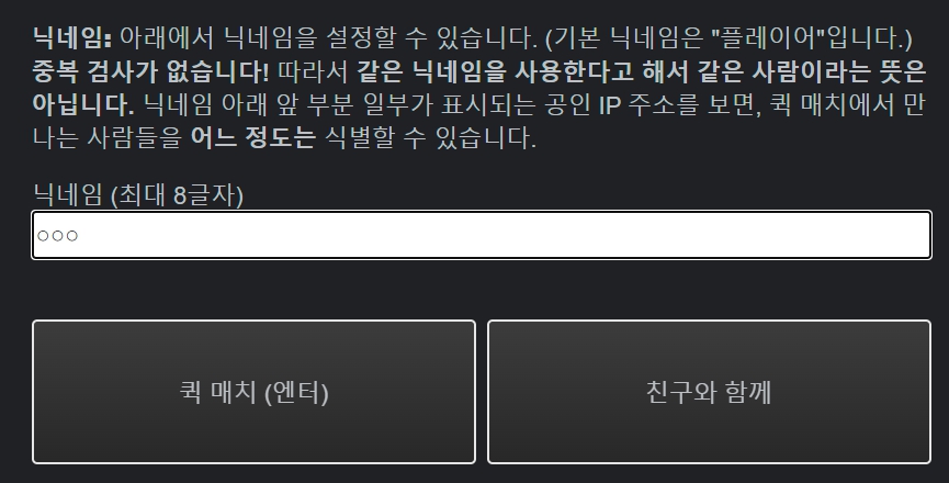 그러면 닉네임을 설정할 수 있으며, 퀵 매치 (엔터) / 친구와 함께를 고를 수 있습니다.