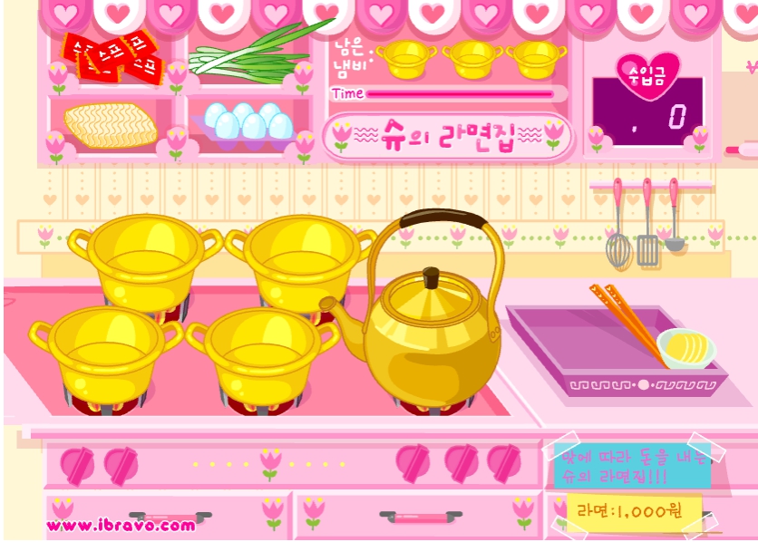기본적인 화면이며, 냄비 4개를 활용하여 라면을 만들 수 있습니다. 이상한게 라면은 1,000원인데 손미들이 맛에 따라 돈을 냅니다. 500원을 줄 때나 심한 경우 안 줄 때도 있습니다. 당연히 모든 재료를 넣어 타이밍 맞게 완성 시켜야 1,000원을 받을 수 있습니다.