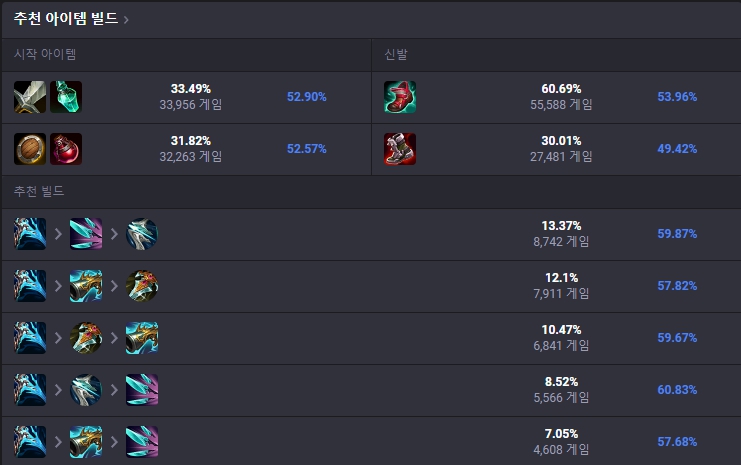 처음 시작 아이템은 보통 롱소드와 충전형 물약 또는 도란의 방패와 포션 하나로 시작하며, 첫 코어 아이템으로는 정수 약탈자를 올려줍니다. 정수 약탈자를 올린 뒤 신발은 보통 아이오니아 장화를, 상대팀에 기본 공격 위주의 챔피언이 많거나 적이 올 AD인 경우에는 판금 장화를 올려줍니다. 이후에는 나보리 신속검, 돌풍 템트리를 띄우거나, 아니면 징수의 총, 자객의 발톱 템트리를 띄워주면 되겠습니다.