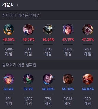 갱플랭크의 카운터 챔피언은 올라프, 퀸, 렝가, 이렐리아, 클레드로 집계되었으며, 상대하기 쉬운 챔피언은 릴리아, 아칼리, 야스오, 크샨테, 그라가스로 집계되었습니다.