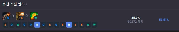 1레벨에는 E스킬, 2레벨에는 Q스킬, 3레벨에는 W스킬을 찍어준 뒤 4레벨부터는 R-Q-E-W 순서로 스킬을 마스터해주시면 됩니다.