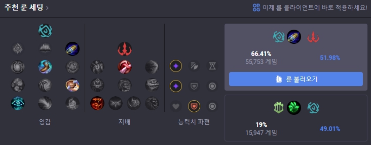 갱플랭크 룬은 영감에서 선제공격을 메인으로 사용하고 하위 룬으로는 마법의 신발, 비스킷 배달, 우주적 통찰력을 들어줍니다. 보조룬으로는 지배에서 피의 맛, 보물 사냥꾼을 들어주고 능력치 파편으로는 적응형 능력치 두 개와 상대 라이너에 따라 방어력 혹은 마법 저항력을 들어줍니다.