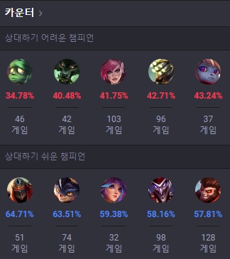그레이브즈의 카운터 챔피언은 아무무, 워윅, 바이, 마스터 이, 뽀삐로 집계되었으며, 상대하기 쉬운 챔피언은 제드, 럼블, 릴리아, 샤코, 오공으로 집계되었습니다.