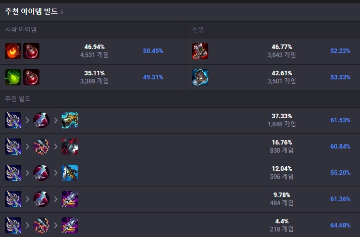 처음 시작 아이템은 새끼 화염발톱과 포션 하나로 시작하여 첫 코어 아이템으로는 그림자 검을 올려줍니다. 그림자 검을 올린 뒤 신발은 상대팀 챔피언들을 보고 판금 장화나 헤르메스를 골라 올려줍니다. 이후에는 월식, 징수의 총 템트리 또는 선혈포식자, 칠흑의 양날도끼 템트리를 띄워줍니다. 이후에는 멜모셔스, 세릴다, 수호천사 등 상황에 맞게 유동적인 템트리를 올려줍니다.