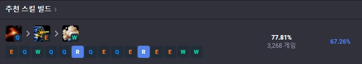 1레벨에는 E스킬, 2레벨에는 Q스킬, 3레벨에는 W스킬을 찍어준 뒤 4레벨부터는 R-Q-E-W 순서로 스킬을 마스터해주시면 됩니다.