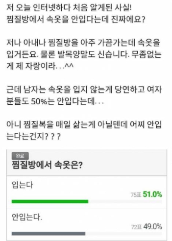찜질방에 갔을 때 찜질복 안에 속옷을 입는지, 입지 않는지에 대한 분쟁으로, 의견이 분분합니다. 물론, 정답은 없는 문제이기 때문에 각자의 판단에 맞게 착용하면 되겠습니다.