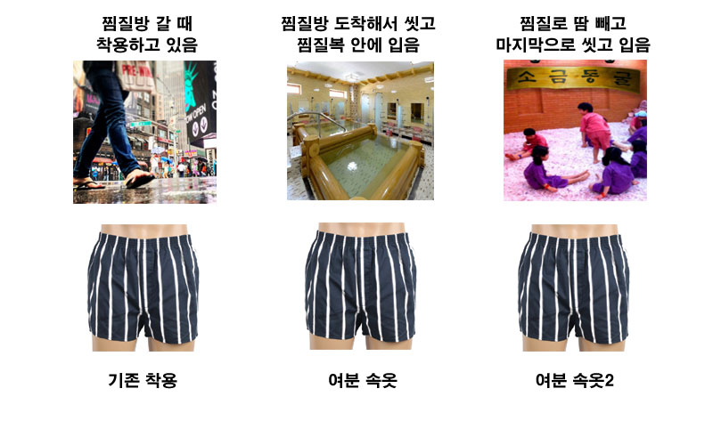 귀찮아하는 성격이라 그런지 저는 입지 않는 편입니다. 위의 이미지를 보면 더 이해하기 쉬울텐데요, 찜질방을 가서 씻을건데 굳이 씻고 가지는 않고, 그렇다고 속옷을 안 입고 가지는 않을테니 일단 기존에 입고있던 속옷이 있습니다. 찜질방 도착해서 당연히 일단 샤워든 목욕이든 하고 이후 찜질복으로 갈아입죠. 이때 안에 속옷을 입는다면 찜질방 올 때 입었던 속옷을 입는 것은 개인적으로 찝찝합니다. 여분의 속옷을 입는다고 하는 경우, 결국 찜질을 하면서 땀을 많이 빼는데, 그러면 마지막에 또 씻을 때 여분의 속옷이 하나 더 있어야 합니다. 그러면 여분의 속옷이 두 벌 필요하죠. 이러한 이유로 그냥 찜질복 안에 속옷을 입지 않습니다.