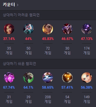 서폿 아무무의 카운터 챔피언은 자이라, 질리언, 렐, 샤코, 알리스타로 집계되었으며, 상대하기 쉬운 챔피언은 벨코즈, 트위치, 유미, 바드, 럭스로 집계되었습니다.