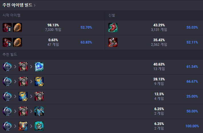 처음 시작 아이템은 고대유물 방패와 포션 두 개로 시작하여 첫 코어 아이템으로는 저녁갑주를 올려줍니다. 저녁갑주를 올린 뒤 신발은 상대 조합을 보고 AD딜에 버티기 힘들면 판금 장화를, 그게 아니라면 아이오니아 장화를 올려줍니다. 이후에는 가시 갑옷을 띄워준 뒤 상황에 맞게 얼어붙은 심장, 존야의 모래시계, 대자연의 힘 등 유동적인 템트리를 올려줍니다.