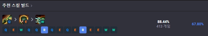 1레벨에는 Q스킬, 2레벨에는 E스킬, 3레벨에는 W스킬을 찍어주고, 4레벨부터는 R-Q-E-W 순서로 스킬을 마스터해주시면 됩니다.