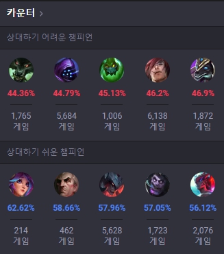탑 이렐리아의 카운터 챔피언은 워윅, 잭스, 자크, 세트, 나서스로 집계되었으며, 상대하기 쉬운 챔피언은 릴리아, 스웨인, 아트록스, 문도 박사, 요네로 집계되었습니다.