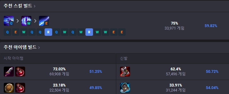 처음 시작 아이템은 도란의 검과 포션 하나로 시작하여 첫 코어 아이템으로는 몰락한 왕의 검을 올려줍니다. 몰왕을 올린 뒤 신발은 상대 조합에 따라 판금 또는 헤르메스를 올려줍니다. 이후에는 상황에 맞게 유동적으로 마법사의 최후, 해신 작쇼, 불멸의 철갑궁, 죽음의 무도 등의 템트리를 올려줍니다.
