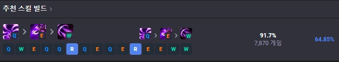 1레벨에는 Q스킬, 2레벨에는 W스킬, 3레벨에는 E스킬을 찍어줍니다. 4레벨부터는 R-Q-E-W 순서로 되는대로 찍어주시면 됩니다.