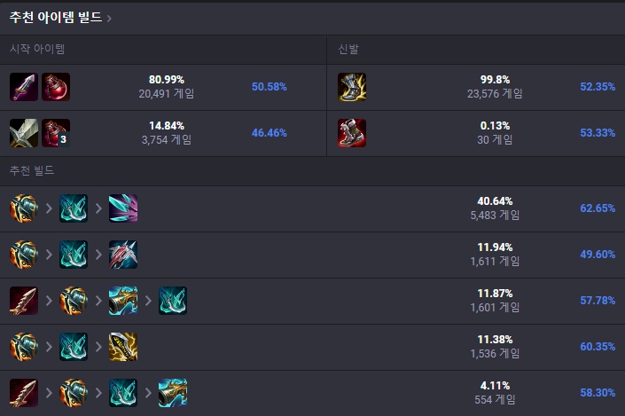 처음 시작 아이템은 도란의 검과 포션 하나로 시작하여 첫 코어 아이템으로는 크라켄 학살자를 올려줍니다. 1코어를 올린 뒤 신발은 광전사의 군화를 띄우고 이후에는 유령 무희까지 고정으로 띄워줍니다. 이후에는 나보리 신속검, 도미닉 경의 인사, 무한의 대검, 징수의 총 등 상황에 맞게 유동적인 템트리를 올려줍니다.