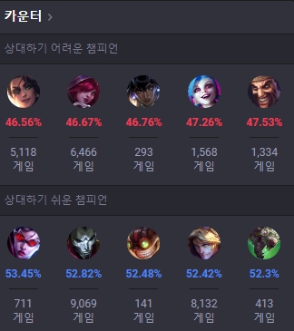카이사의 카운터 챔피언은 사미라, 자야, 닐라, 징크스, 드레이븐으로 집계되었으며, 상대하기 쉬운 챔피언은 베인, 진, 직스, 이즈리얼, 트위치로 집계되었습니다.