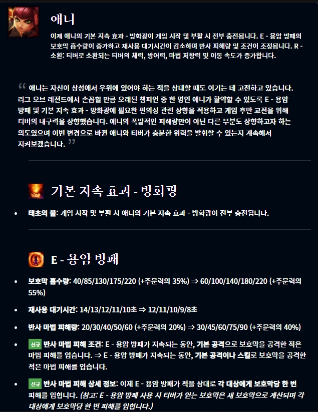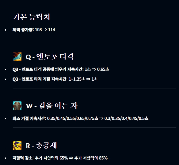 간단하게 챔피언 부분에서는 알리스타,브라움, 자르반 4세, 케일, 케인, 르블랑, 노틸러스, 파이크, 라칸, 쓰레쉬, 트런들이 버프되었습니다. 반면 애니, 아무무, 카사딘, 크샨테, 자크는 너프되었죠. 또 하나 중요한 것은 아우렐리온 솔(아우솔)이 리워크되었다는 소식입니다. 그 외에는 룬에서 과다치유, 아이템에서 광휘의 미덕, 그림자 검이 변경되었습니다. 또한 강인함 시스템이 조정되었다고 합니다.