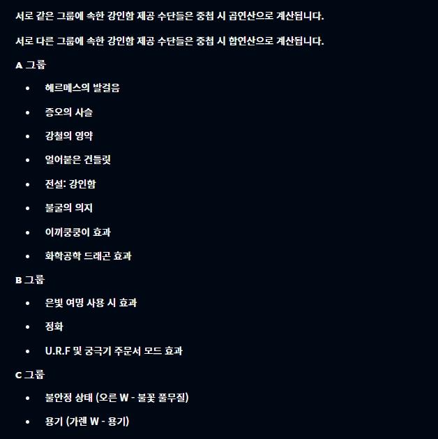 강인함 계산 방식이 이제 그룹별로 나뉘게 되고, 서로 같은 그룹에 속한 경우 중첩 시 곱연산, 다른 그룹인 경우 중첩 시 합연산으로 계산된다고 합니다.