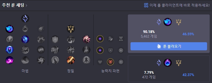 유미 룬은 마법에서 콩콩이를 메인으로 사용하고 하위 룬으로는 마나순환 팔찌, 깨달음, 주문작열을 들어줍니다. 보조룬으로는 정밀에서 침착, 체력차 극복을 들어주고 능력치 파편으로는 적응형 능력치 두 개와 방어력을 들어줍니다.