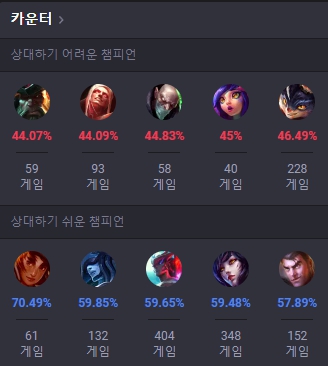 미드 애니의 카운터 챔피언은 갱플랭크, 블라디미르, 신지드, 니코, 럼블로 집계되었으며, 상대하기 쉬운 챔피언은 탈리야, 리산드라, 요네, 아리, 제이스로 집계되었습니다.