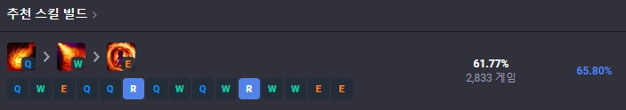 1레벨에는 Q스킬, 2레벨에는 W스킬, 3레벨에는 E스킬을 찍어준 뒤 4레벨부터는 R-Q-W-E 순서로 스킬을 마스터해줍니다. 만약 상대방이 초반 평타 짤짤이를 많이 사용하는 챔피언이라면 E를 찍어 1렙 딜교에서 E를 쓰고 평타로 공격하는 경우 딜교에서 이득을 볼 수 있습니다.