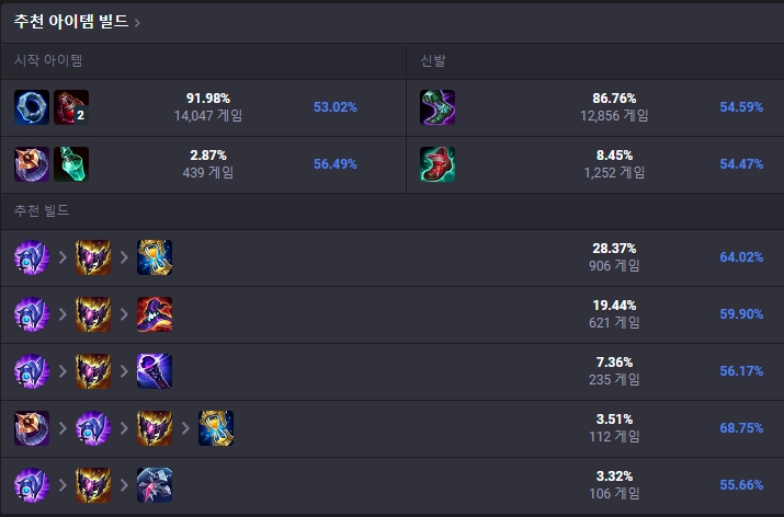 처음 시작 아이템은 도란링과 포션 두 개로 시작하여 첫 코어 아이템으로는 루덴의 폭풍을 올려줍니다. 루덴의 폭풍을 올린 뒤 신발은 마법사의 신발을 올리고, 이후에는 그림자불꽃까지 고정으로 띄워줍니다. 이후에는 라바돈의 죽음 모자, 존야의 모래시계, 공허의 지팡이, 벤시의 장막 등 상황에 맞게 유동적인 템트리를 올려줍니다.