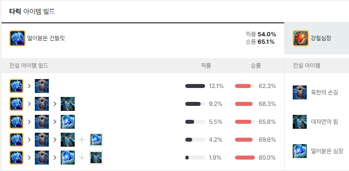 처음 시작 아이템은 루비수정으로 시작하여 첫 코어 아이템으로는 얼어붙은 건틀릿을 올려줍니다. 이후 혹한의 손길까지는 고정으로 올려주고 이후 아이템은 얼어붙은 건틀릿, 대자연의 힘을 상황에 맞게 유동적으로 올려줍니다.