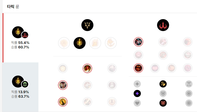 우르프 타릭 룬은 정밀에서 치명적 속도를 메인으로 사용하고 하위 룬으로는 승전보, 전설: 민첩함, 최후의 일격을 들어줍니다. 보조룬으로는 지배에서 비열한 한 방과 보물 사냥꾼을 들어주고 능력치 파편으로는 공격 속도, 적응형 능력치, 방어력을 들어줍니다.