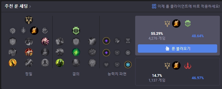 카사딘 룬은 정밀에서 기민한 발놀림을 메인으로 사용하고 하위 룬으로는 침착, 전설: 강인함, 최후의 일격을 들어줍니다. 보조룬으로는 결의에서 재생의 바람, 과잉성장을 들어주고 능력치 파편으로는 적응형 능력치 두 개와 상대 미드라이너에 따라 방어력이나 마법 저항력을 들어줍니다.