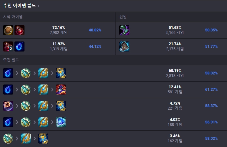 처음 시작 아이템은 도란의 방패와 포션 하나로 시작하여 첫 귀환에서 여신의 눈물을 구매한 뒤 이후 첫 코어로 영겁의 지팡이를 올려줍니다. 영겁의 지팡이를 올린 뒤 신발은 마법사의 신발, 혹은 상대 미드의 AP딜이 너무 쎄다면 버티기 위해 헤르메스를 올립니다. 이후에는 대천사의 지팡이까지 고정으로 띄워고, 그 다음에는 존야의 모래시계, 라바돈의 죽음 모자, 얼어붙은 심장 등 상황에 맞게 유동적인 템트리를 올려줍니다.