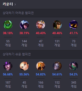 카사딘의 카운터 챔피언은 자크, 탈론, 키아나, 카시오페아, 베이가로 집계되었으며, 상대하기 쉬운 챔피언은 신드라, 럭스, 아지르, 오리아나, 아칼리로 집계되었습니다.