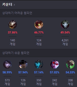 자야의 카운터 챔피언은 코그모, 직스, 진으로 집계되었으며, 상대하기 쉬운 챔피언은 아펠리오스, 닐라, 칼리스타, 베인, 트위치로 집계되었습니다.