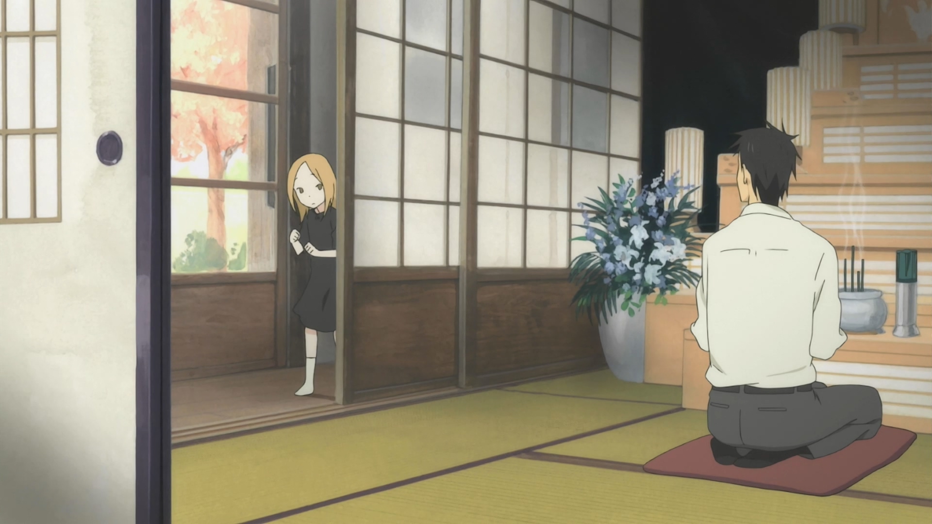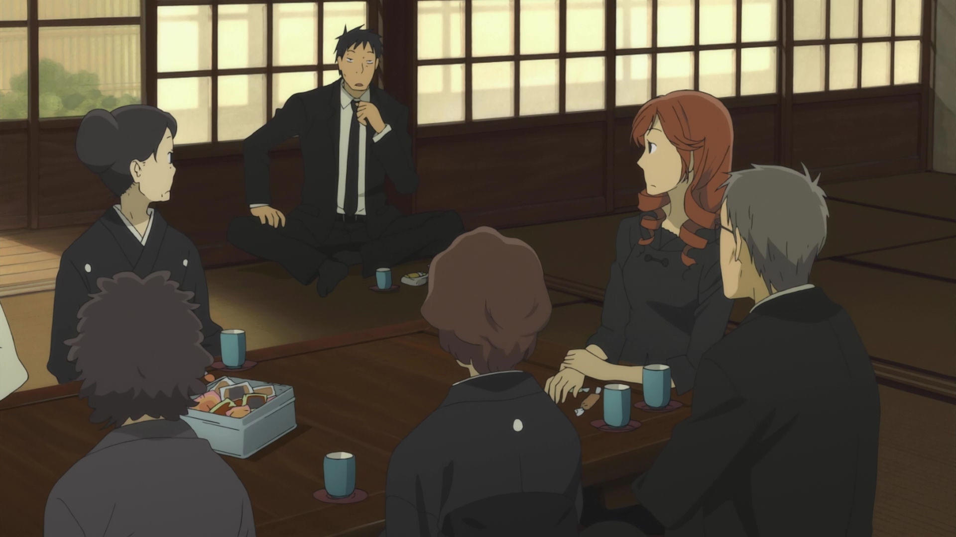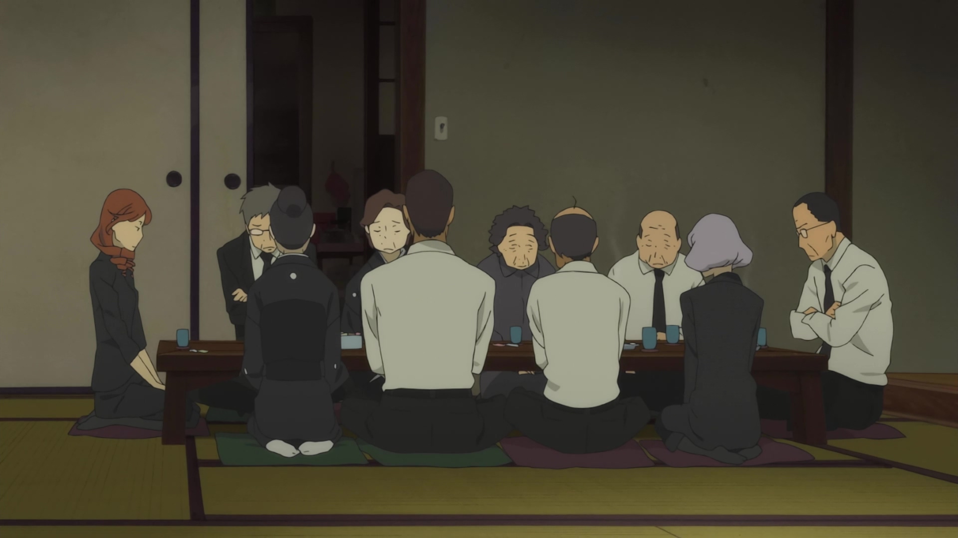 다이키치가 남아서 분향을 한다고 하고, 다른 어른들은 다 들어가서 잡니다. 그 장소에 남아있던 졸려하는 린에게도 "너도 어서 자고와"라고 말하지만 린은 괜찮고 합니다. 결국 린은 담요 하나를 덮은 채 다이키치의 옆에서 잠을 잡니다.