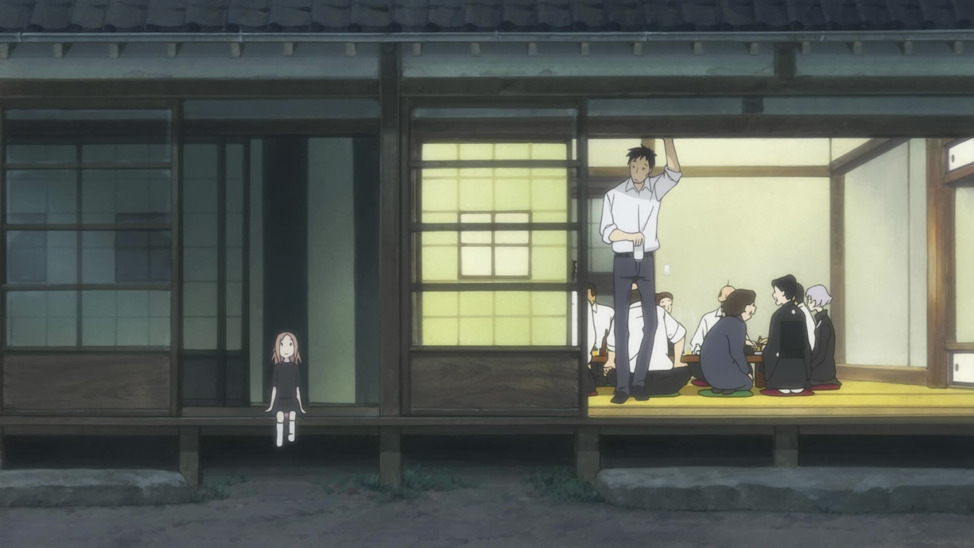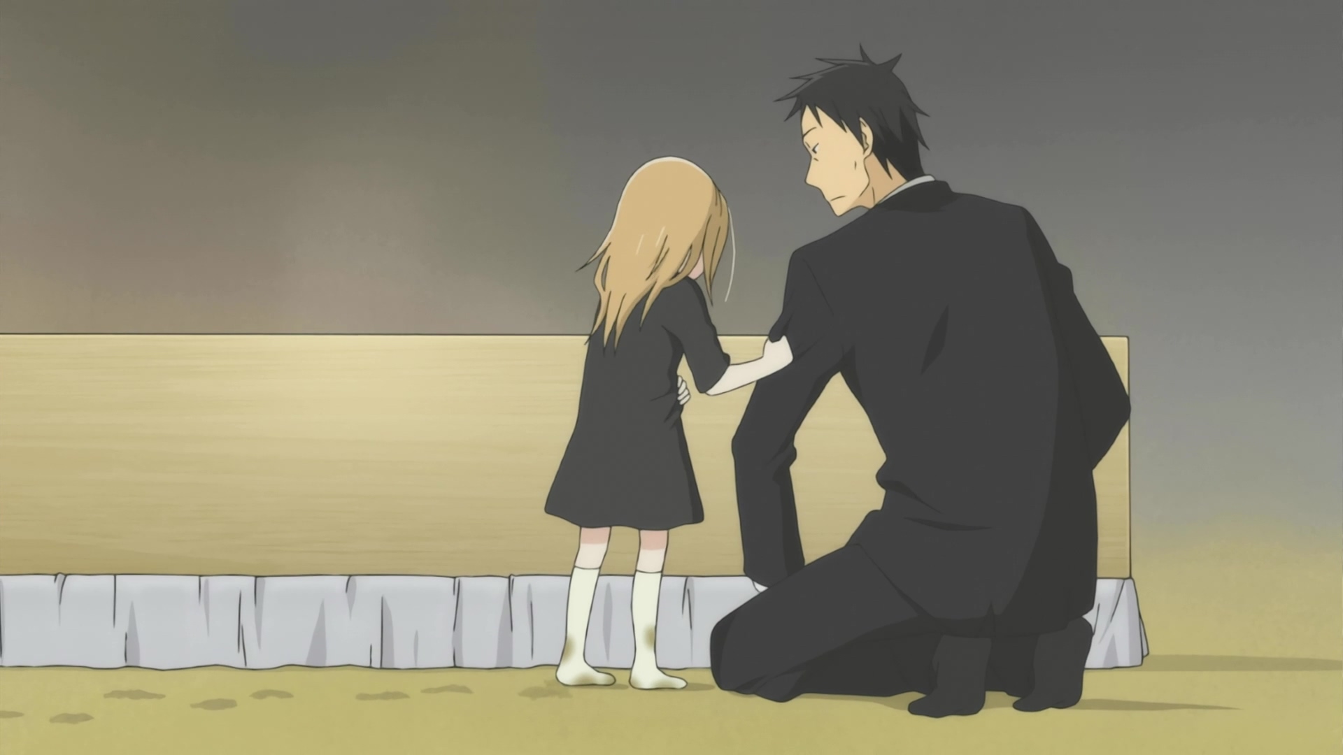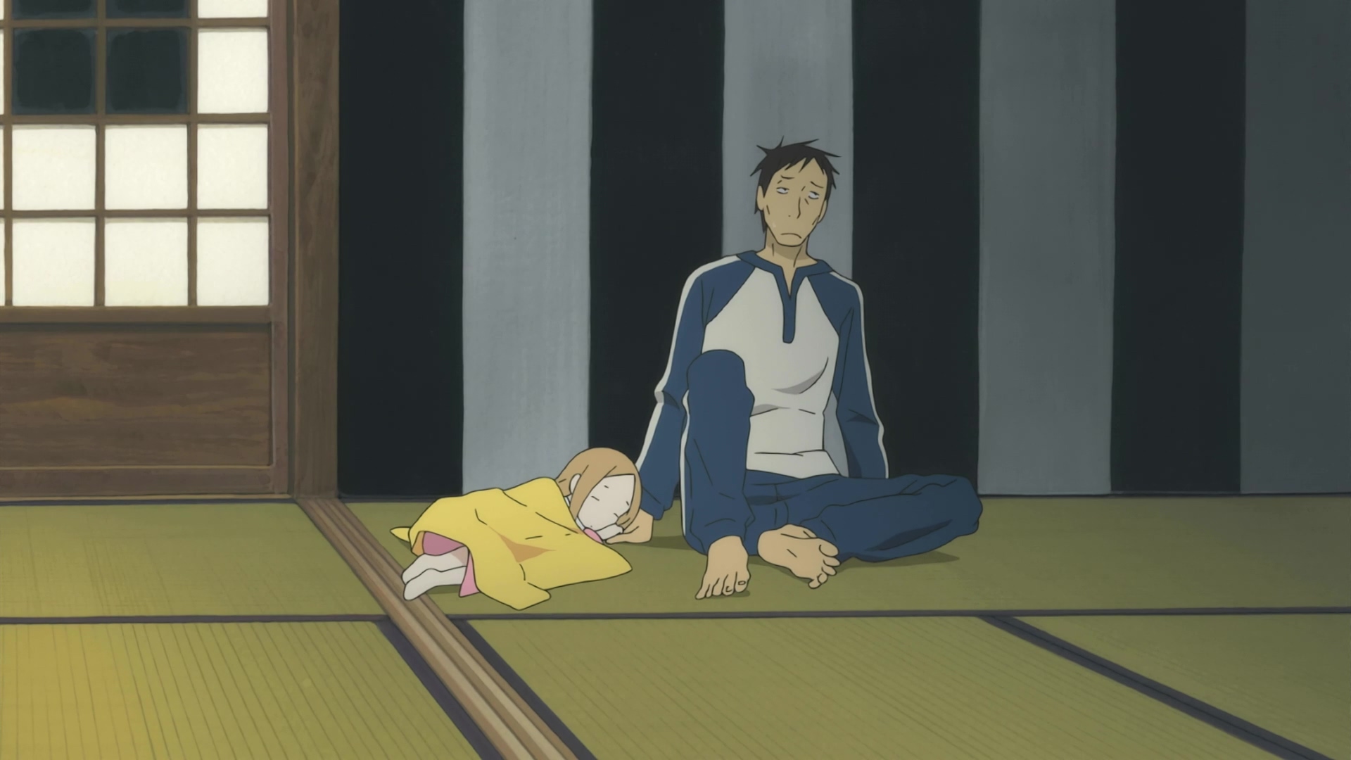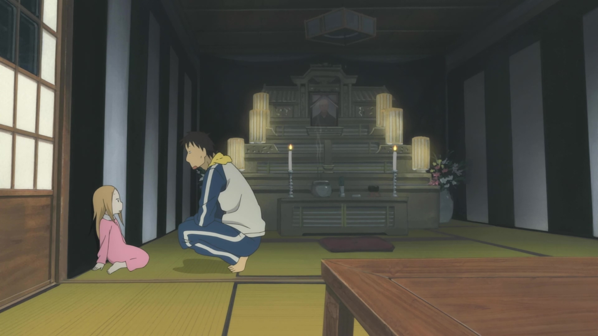 다이키치가 남아서 분향을 한다고 하고, 다른 어른들은 다 들어가서 잡니다. 그 장소에 남아있던 졸려하는 린에게도 "너도 어서 자고와"라고 말하지만 린은 괜찮고 합니다. 결국 린은 담요 하나를 덮은 채 다이키치의 옆에서 잠을 잡니다.